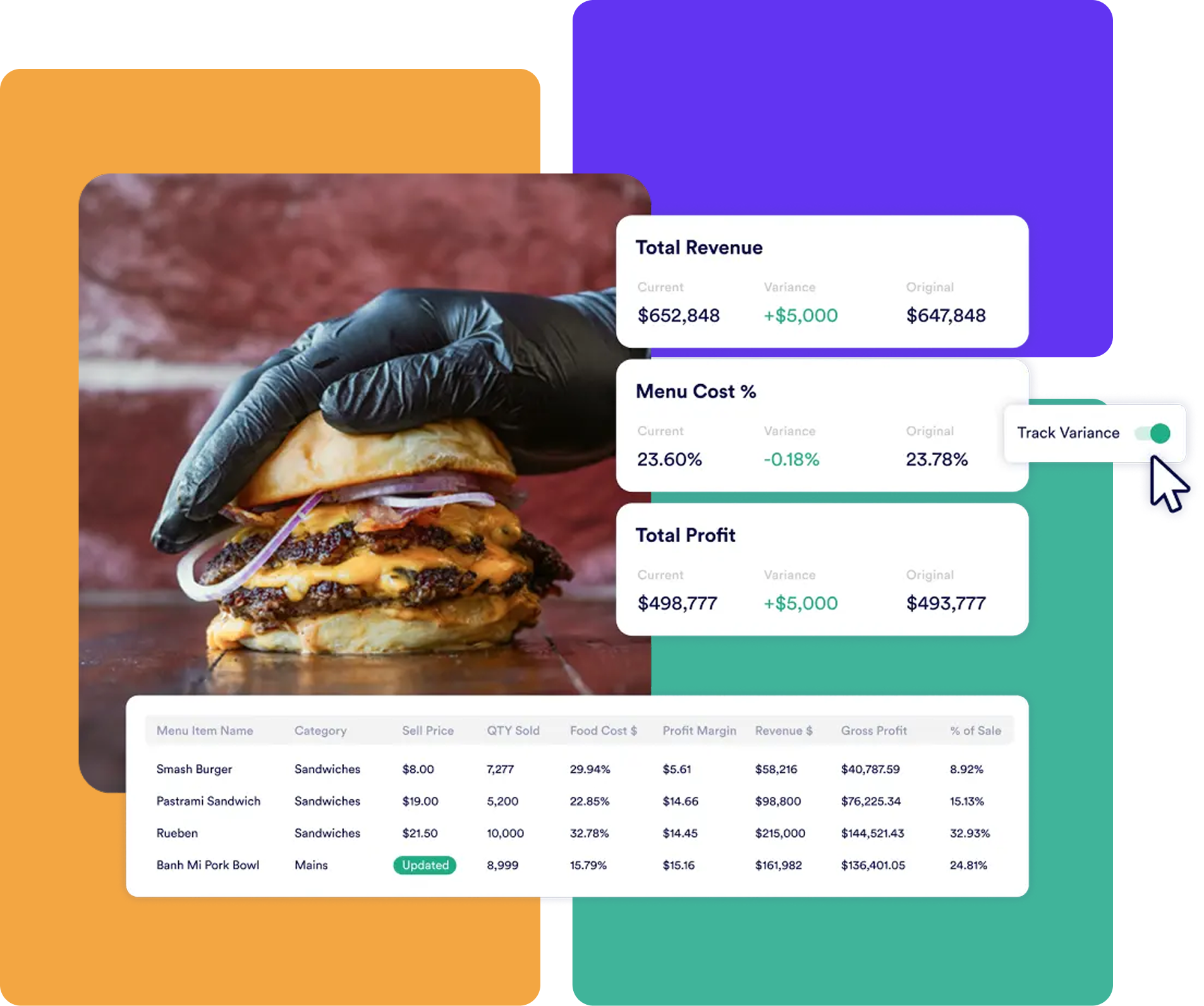 Connect recipes, ingredients, and sales data to analyze food cost %, profit margins, and revenue impact. Test changes to portion sizes, pricing, and ingredients in real-time.
