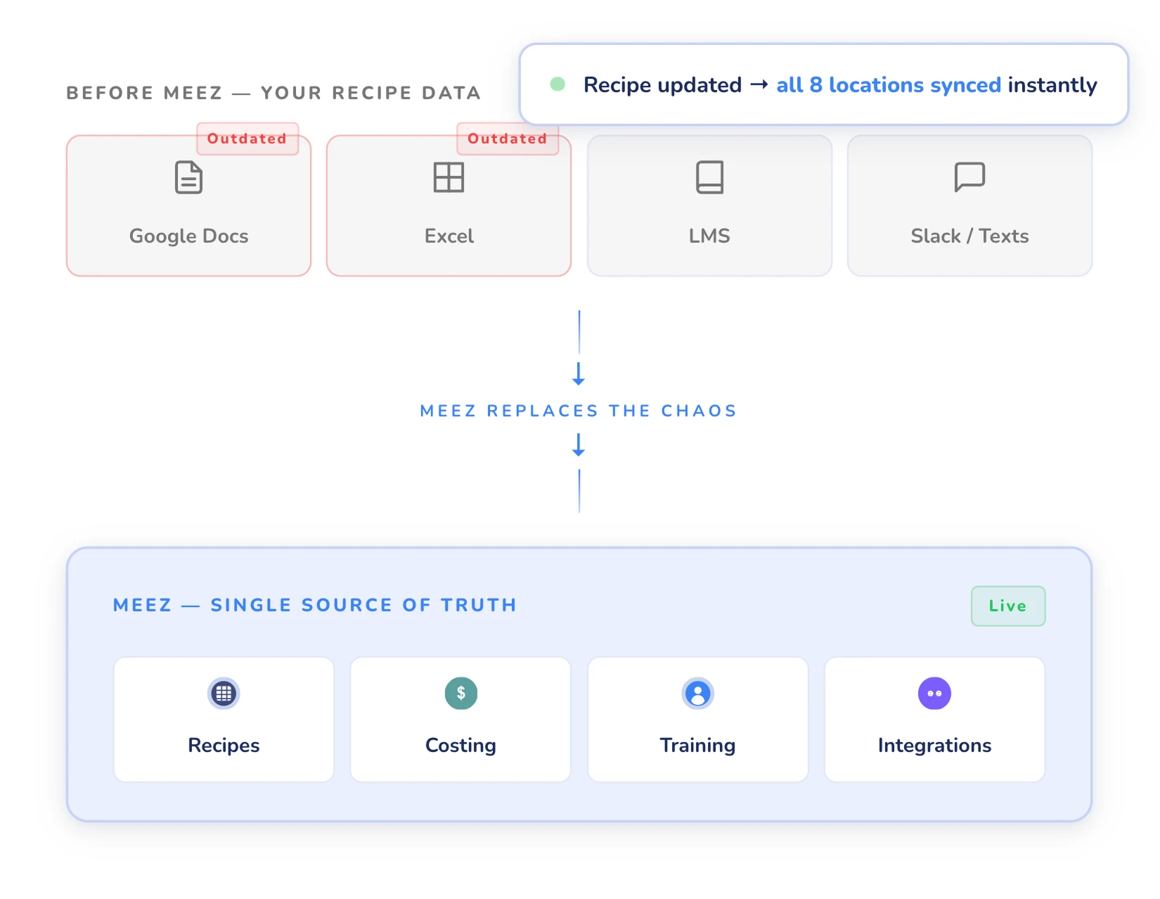 When a chef changes a spec in meez, it flows everywhere — costing, training materials, allergen info, FOH menu details. No more chasing down outdated versions. No more manual syncing across departments.