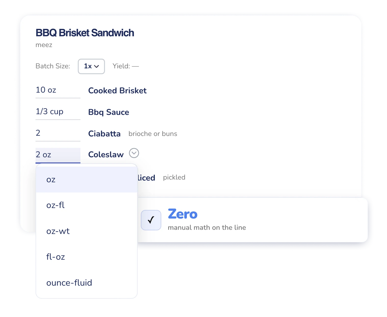 One of the biggest sources of food cost variance is batch prep — too much and you're throwing money away, too little and you're 86'ing menu items at 7pm on a Saturday. meez handles the math so your team doesn't have to.