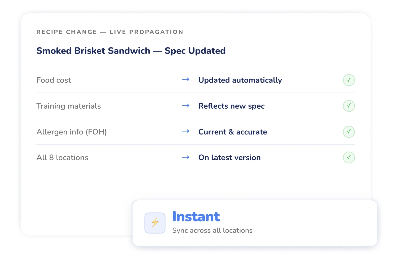 Every chef and cook accesses your live recipe library from any device. They're cooking to your spec from day one.